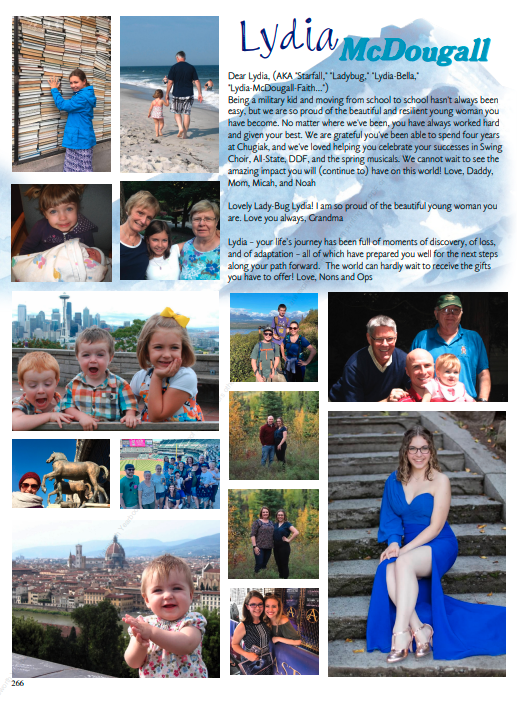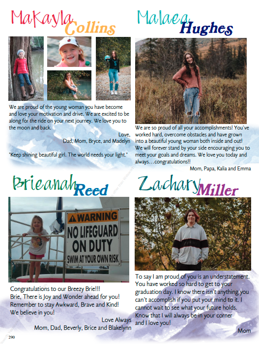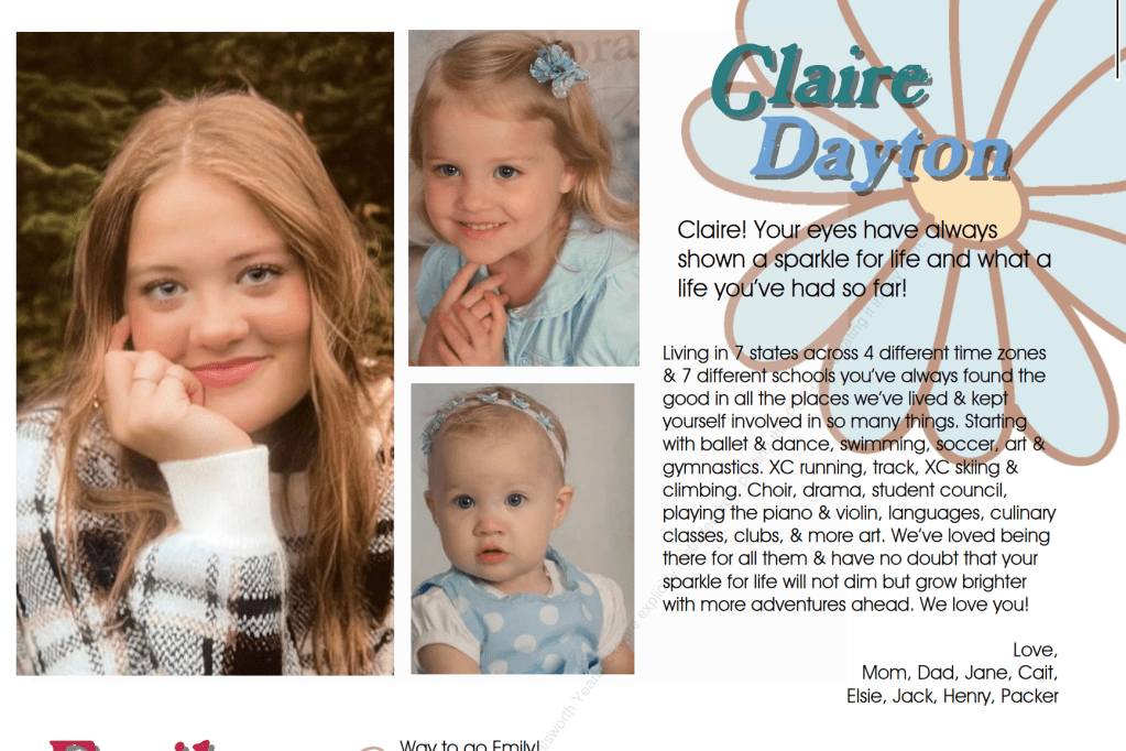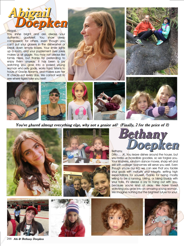 - Preferably, families can work together to design and pay for the ad. We can put two separate messages on one full page ad if that is what works best for you. Alternatively, families can purchase separate ads for the same student. They will appear on separate pages and we will work with both families to make sure the photos are different and that the ads work in harmony. You can check out last year’s yearbook for examples of both these scenarios.