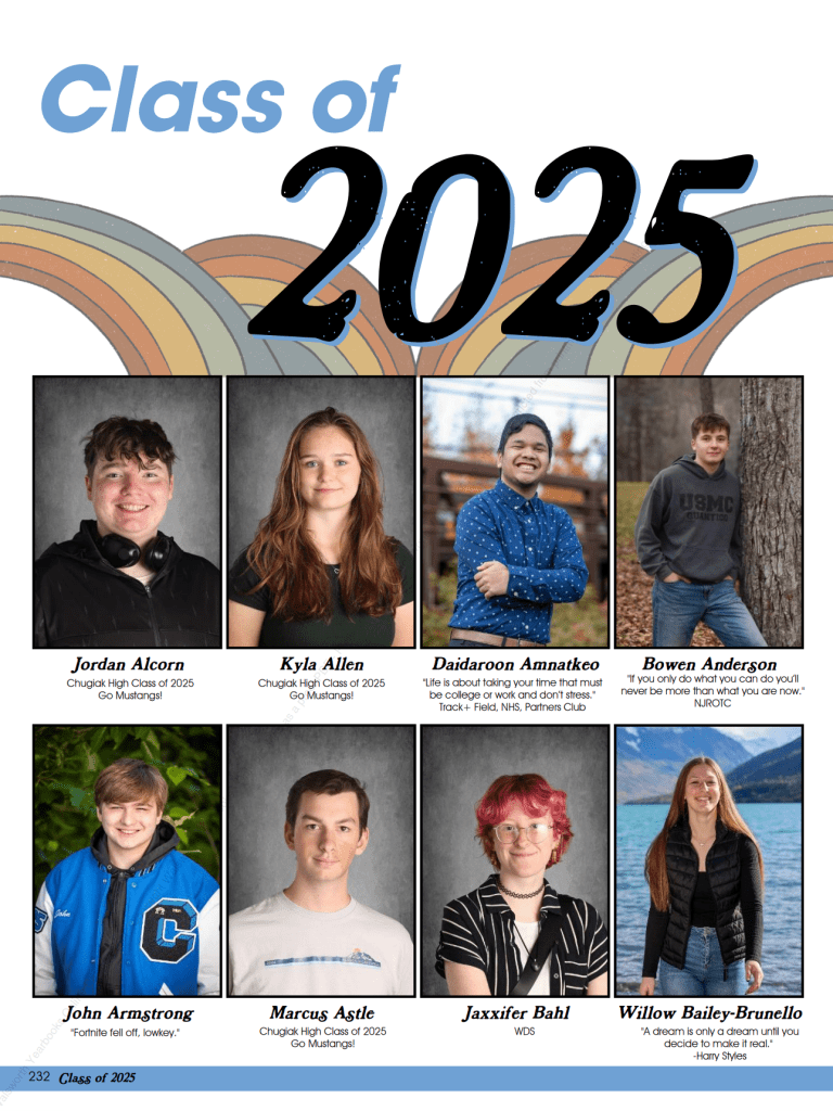 Ad prices are $225 for a full page, $150 for a half, and new this year we are offering quarter pages for $100. We are also offering a single baby photo and a note in ⅛ sizes for $75. Use code EARLY for 10% until October 31. Sales close December 1st,2025. All sale proceeds go directly to yearbook funds to help offset the cost of the yearbook, purchase new cameras and other equipment, and provide training and support to the student-led yearbook staff. Thank you for supporting our student publication!