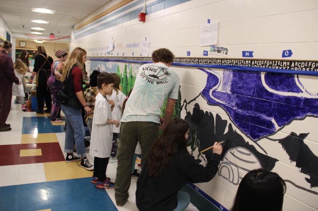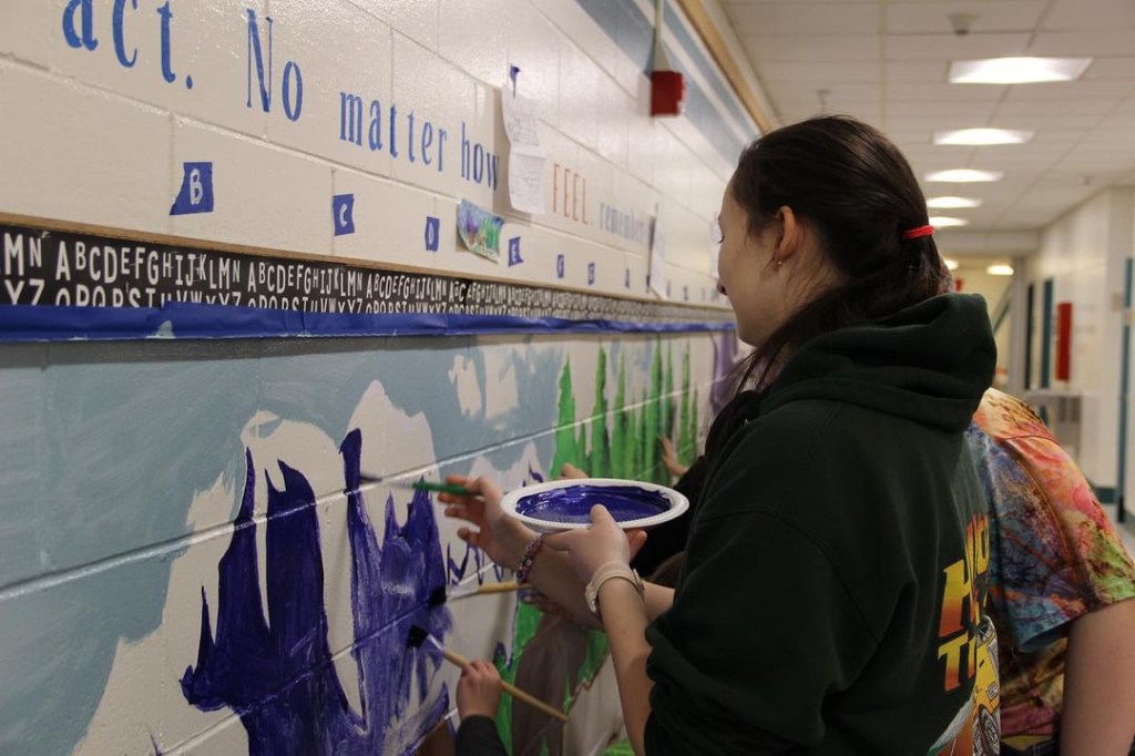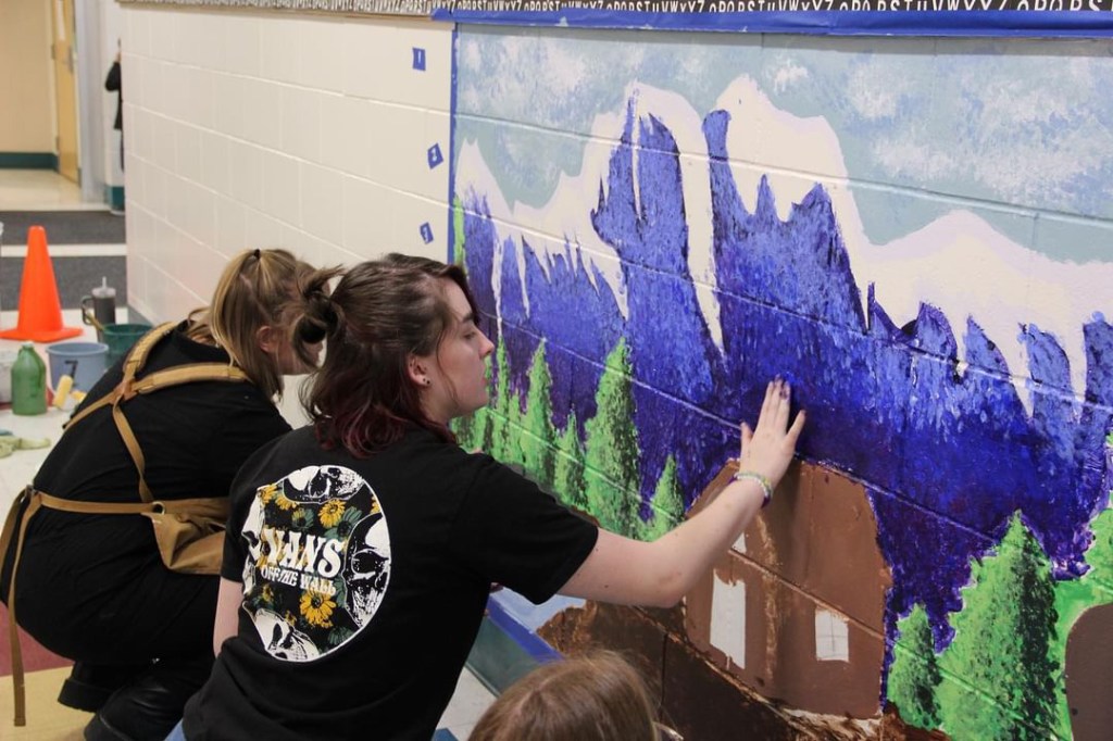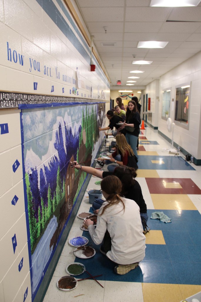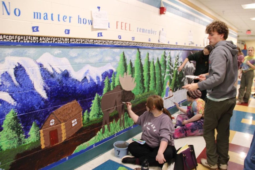 BEST OF ALASKA, ON A WALL, THANKS TO A WALL: Art students traveled to Homestead elementary in February to paint a mural in the main hallway for students to enjoy. Photos by Kelsyn.