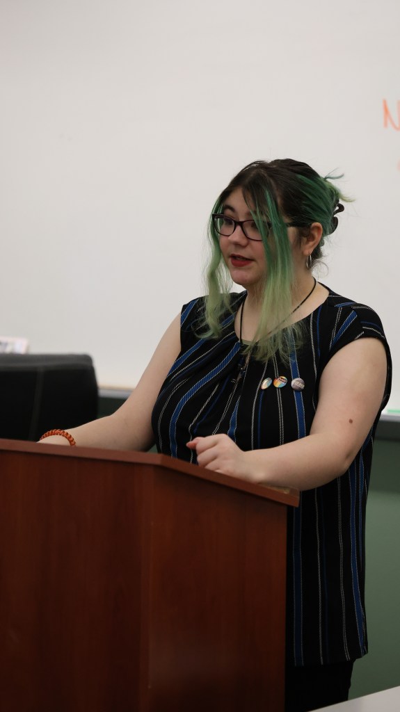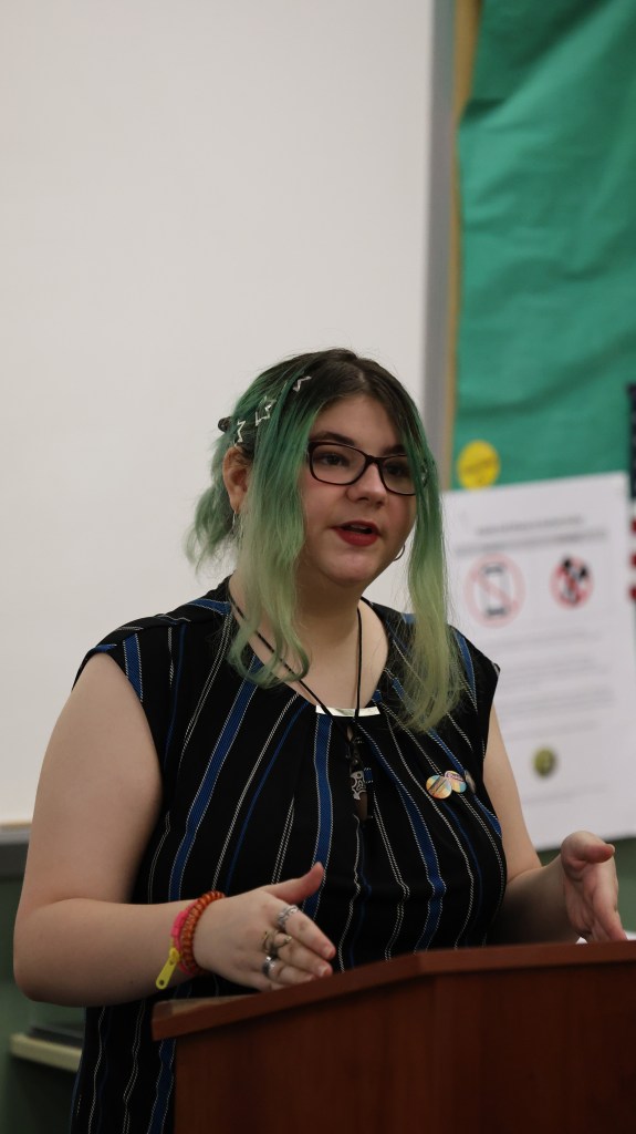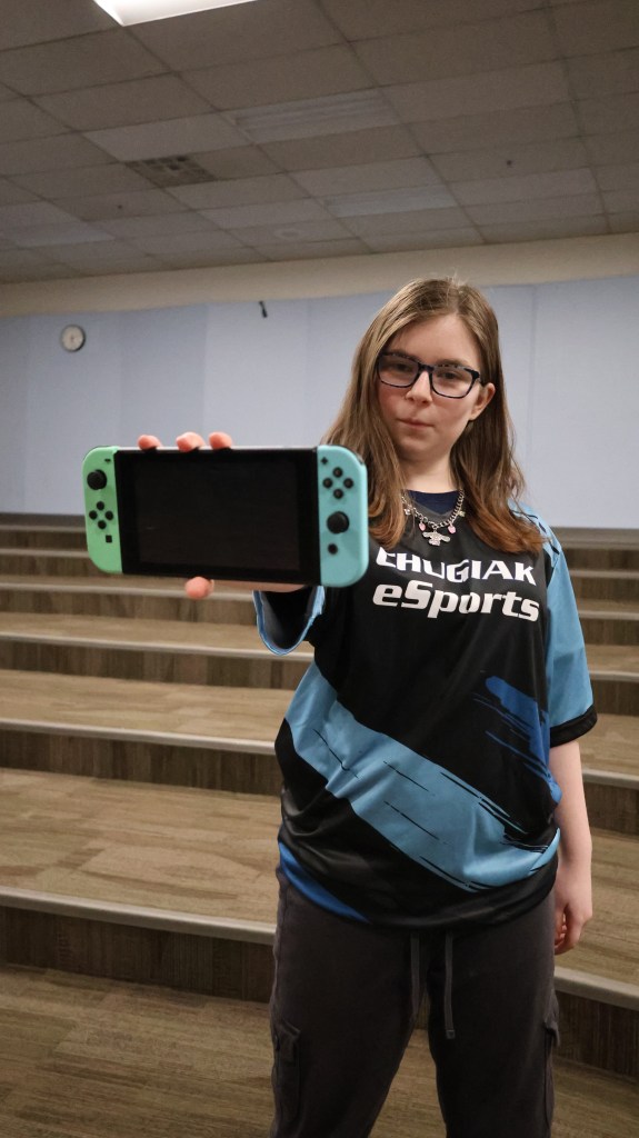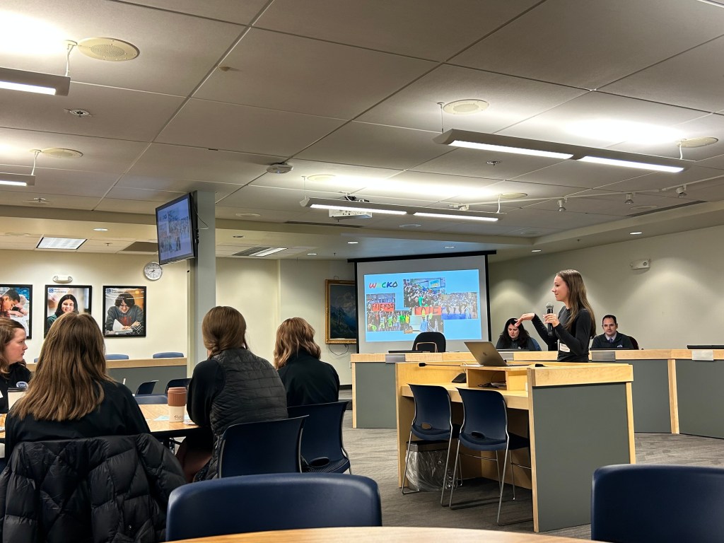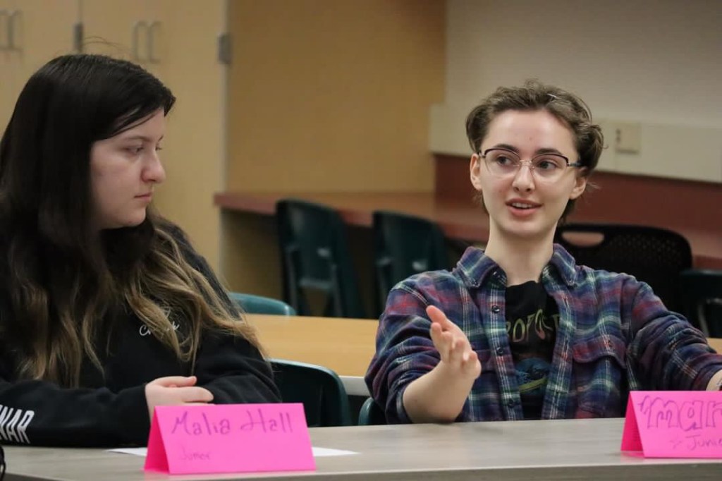 SAB REPORT: Taylor Deschamps presents to the ASD Student Advisory Board and school board members on what makes Chugiak special as part of the yearly school reports rotation. Photo courtesy of Danielle Lewis.